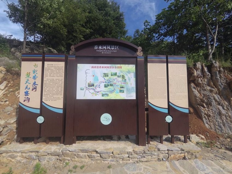 位于湖北南漳县西南38公里处,由香水河峡谷及三景庄、般若寺组成。景区内有奇形与象形山石、洞穴、瀑布群、溪、古树名木、山寨寺庙遗址等。尤以瀑布特征最为显著,在不太长的地段上分布着三叠瀑、七彩瀑、雄鹰瀑等数十个瀑布。最为奇特的“七彩瀑”,落差百余米,由5股清泉汇集而成,晴日上午8时至11时,太阳光从林间射下,与飞瀑溅起的水珠逆向角度,便现出扑朔迷离之状:赤、橙、黄绿、青、蓝、紫,如彩虹当空,晶光闪烁,福祥之气溢满山野。被誉为"楚天九寨沟","小庐山",在不足3公里地带上,分布着七彩瀑、三叠瀑、雄鹰瀑、凤尾瀑、峡口瀑、药仙瀑、织女瀑、泪水瀑、手扳岩瀑、一线天、鳄鱼岛、古渠、水车等50多个景点,各景点相互连贯,景景相印,景中有景,扑朔迷离,目不暇接。一瀑一重天,一步一处景。香水河是一个令人惊艳的地方,她拥有国内罕见、湖北独有的七彩瀑;一波三折如绸似缎的三叠瀑;展翅凌空搏击的飞鹰瀑;形象逼真的金鱼戏水、碧青湛绿的青潭……