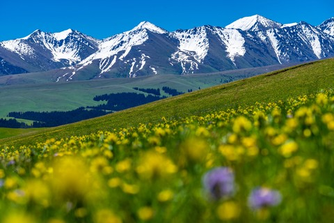 11:00 吃过午饭后前往新疆另外一条著名的网红公路【伊昭公路】。这里每年只有6月-10月通车。美丽的雪山,辽阔的大草原,蓝天、白云,漫山遍野的牛羊,还有昭苏的骏马。漫山遍野的油菜花到处盛开,满眼尽是美景。