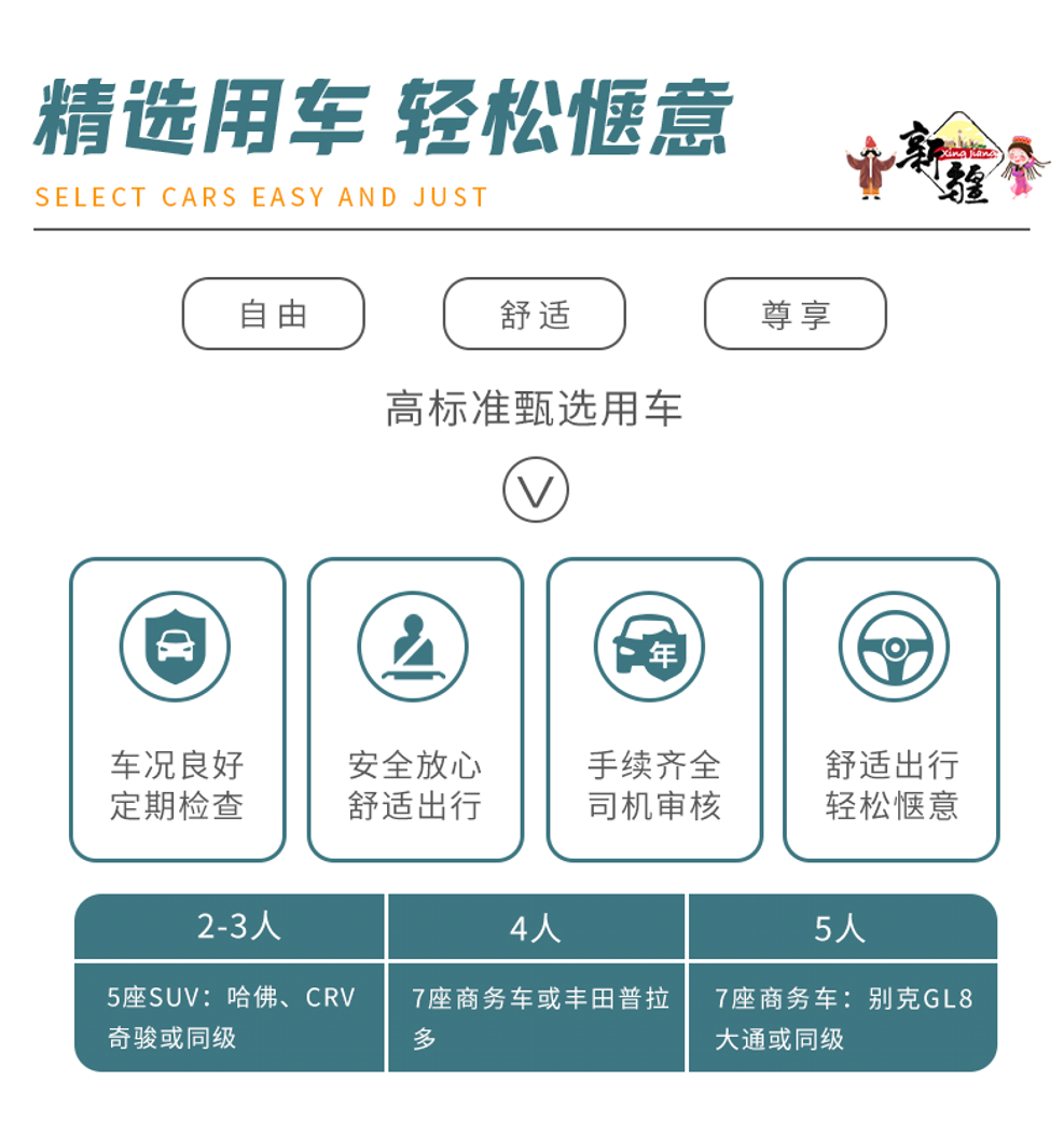 3、用车:2-3人安排小型SUV,4人安排丰田普拉多或7座商务车,5人安排7座商务车,含全程油费、过路费、驾驶员食宿;(注:以实际拼团人数安排车型,非独立成团,乘坐人数标准不含司机车位。)