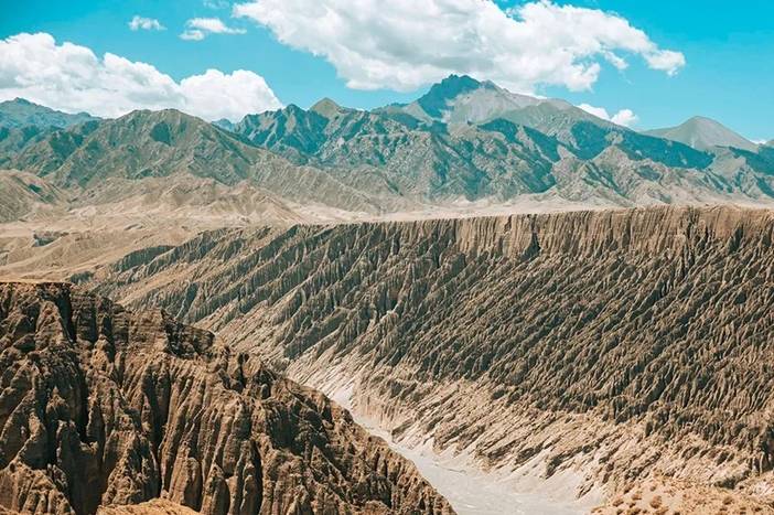 11:00 近三小时的路程我们来到了“飞驰人生”拍摄地【独山子大峡谷】。经过河水亿万年的怒吼奔腾和雨水的冲刷、风雪的蚀雕,成就了一处让人惊叹的流水侵蚀奇观。