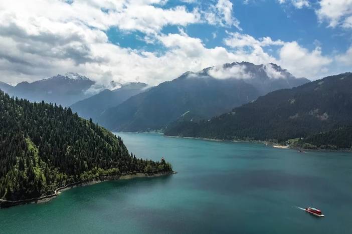 14:00 抵达著名的旅游胜地【天山天池】。湖水晶莹如玉,倒映着博格达峰,四周群山环抱,山上布满了挺拔、苍翠的云杉、塔松,犹如仙境。推荐下午晚些时候去,因为随着光线的变化,湖水会呈现近处碧绿远处蓝色的样子。