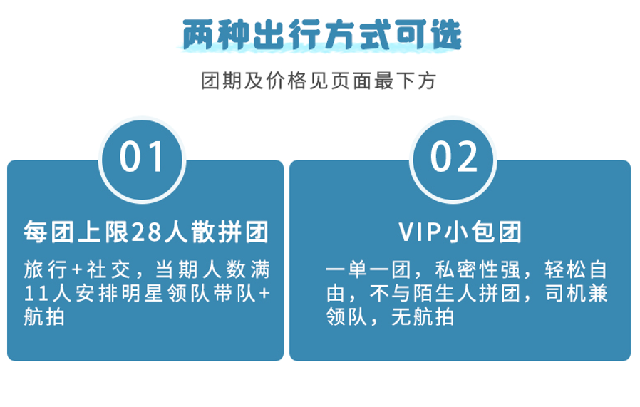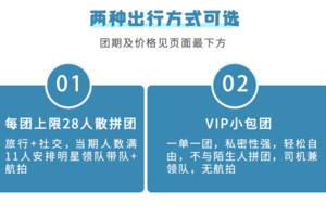 【VIP小包团活动费用】:(2人起天天发团,司机兼领队,无航拍)