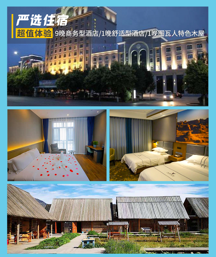 1、住宿:乌鲁木齐商务型酒店双标间1晚,鄯善县商务型酒店双标间1晚,和硕商务型酒店双标间1晚,巴音布鲁克镇舒适型酒店双标间1晚,伊宁市商务型酒店双标间1晚,精河县商务型酒店双标间1晚,乌尔禾商务型酒店双标间1晚,禾木木屋双标间1晚,贾登峪商务型酒店标间1晚,福海商务型酒店双标间1晚,富蕴县商务型酒店双标间1晚。