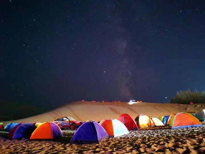 17:00沿着山路翻过当金山就到敦煌了,晚上在【沙漠星空露营】,体验越野摩托沙漠冲浪,超嗨沙漠轰趴,唱起沙漠室外篝火KTV(如遇下雨或恶劣天气则取消沙漠轰趴、室外篝火KTV及沙漠冲浪,不退费用)。