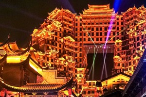 夜幕降临游览七十二奇楼文旅小镇集特色小吃街、酒吧街、作坊街、高端度假酒店、博物馆群等多种休闲业态于一体。标志性建筑109.9米的洞天吊脚楼以建筑形态奇特、镂空门洞奇特、楼层最高等多项“奇葩”开创世界吊脚楼建筑史的奇迹。项目建成后将成为张家界首个夜生活都市小镇和第一高楼。后入住酒店