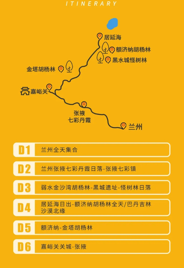 4.门票:七彩丹霞+环保车、弱水金沙湾(包含黑城遗址、怪树林)、额济纳胡杨林+景交车+八道桥景区、居延海门票、金塔胡杨林门票、嘉峪关关城门票;