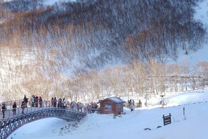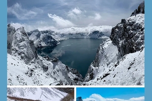 12:30 乘倒站车返回到中转服务站,换乘环保车赴【长白瀑布】,车程约10分钟,步行约20分钟到达长白冰雪瀑布底部近距离观看、摄影,参观【聚龙温泉群】,周围一片白雪,中间却热气腾腾,甚是美丽,游览30分钟,步行20分钟返回瀑布停车场。