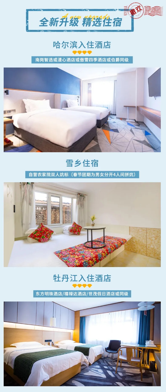 1、住宿:哈尔滨四钻酒店双标间1晚,牡丹江四钻酒店双标间1晚,延吉四钻酒店双标间1晚,雪乡2人间独立卫浴农家炕(春节团期为男女分开4人间拼炕),二道镇四钻温泉酒店双标间1晚,吉林五钻酒店双标间1晚;
