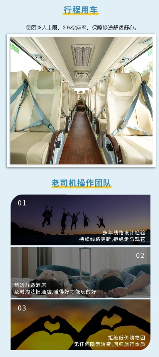 3、用车:正规空调旅游车,确保您在旅途中的安全;