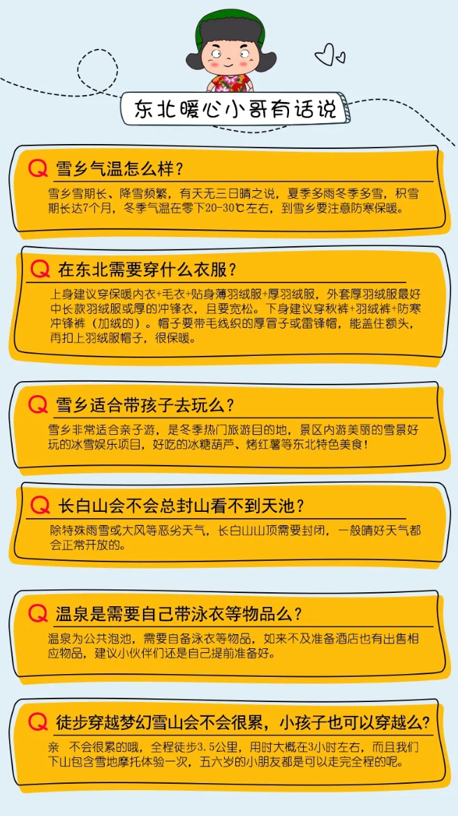 4、门票:雪乡门票+往返环保车、梦幻雪山徒步穿越门票、图们中朝友谊桥门票、朝鲜民俗园门票、长白山门票+往返环保车、雪地漂流门票、万科滑雪不限时包含雪鞋雪板雪杖使用;