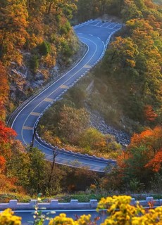 秋天的金寨中国红岭公路就像上帝遗弃在皖西大地的一条巨型彩虹,公路两旁的树木还没有完全变红,松柏的青绿,黄栌的殷红,梧桐树的枯黄,姹紫嫣红之感丝毫不逊色于春暖花开的盛景。