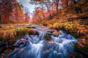 金寨马鬃岭红叶就开始进入最佳观赏的时节。走进深秋的马鬃岭仿佛像走进了一个七彩缤纷的童话世界,秋色在这里绽放得肆意而狂野。 漫山遍野的红叶染红山峦,山中小道上铺满落叶,更有落差极大的瀑布可观赏。