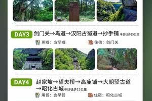 古柏参天:道路两旁有成百上千棵树龄超千年的古柏树,造型各异,遮天蔽日,仿佛置身于绿色的隧道之中,之后前往翠云廊。先秦至秦汉:蜀地内外人们因交流交通需求,开凿了穿越秦岭、大巴山的千里蜀道,形成关中—汉中—蜀中经济文化带,徒步结束后,安排入住酒店,吃饭很方便,美食众多,大家自由选择。