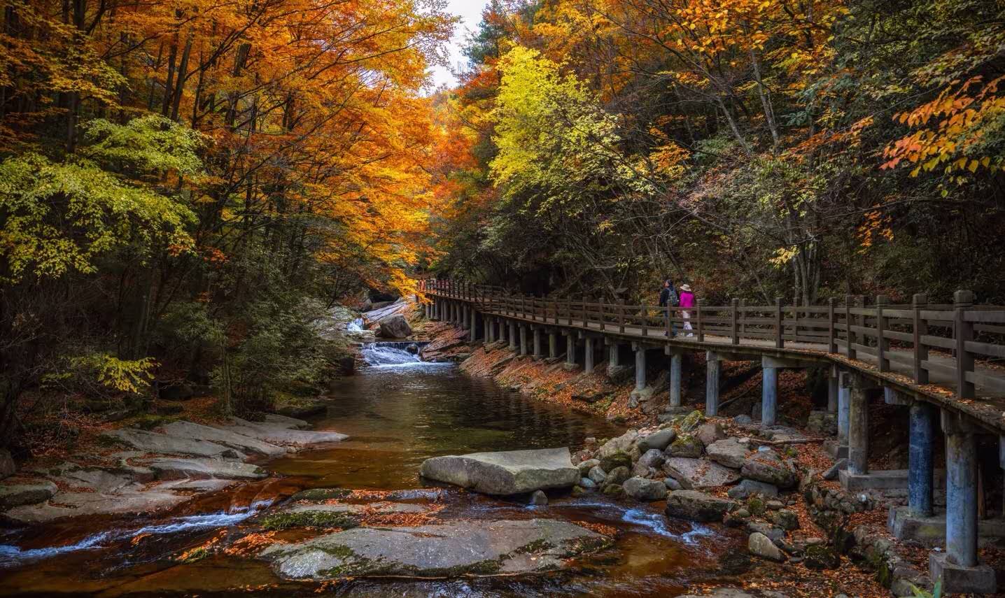 光雾山红叶主景区【米仓山森林公园】(大坝景区)。沿途经过【天然画廊】,遮天蔽日的青冈树林与红叶相呼应,呈现出油画般绚烂亮眼的色彩,美得令人挪不动脚步~登至香炉山山顶,俯瞰山间浩瀚的云海彩林、千沟万壑。朝霞染红天边,伴随着光雾山的沉沉暮霭,山间或金黄、或红艳的色彩变得清晰可见,一眼望去有着无法言语的震撼!我们顺着观光道穿越黄金大道,来到【黑熊沟】。尽管这里长度仅2公里,却聚集了光雾山的精华景色。跌水瀑布飞起白色浪花跌落在深绿色的潭水中,潭水中怪石嶙峋,流水从石中左冲右突,两岸是青冈树,树上的红叶层次分明,暗红色,橙红色、黄色、青黄色......描绘出一幅缤纷绚丽的奇景。木栈道沿沟蜿蜒修建,大家可以在这里尽情拍摄和创作!