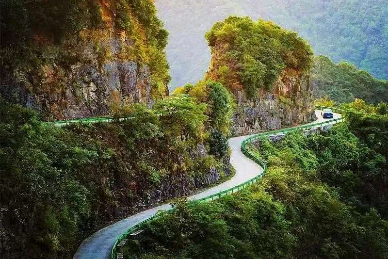 入桃岭,十八弯山路盘旋,峭壁林立,古木参天立于乱石之中,老藤攀于岩壁之上,清泉奔泻于两峰之间,犹如行驶在天路之上,不由得心跳加速。