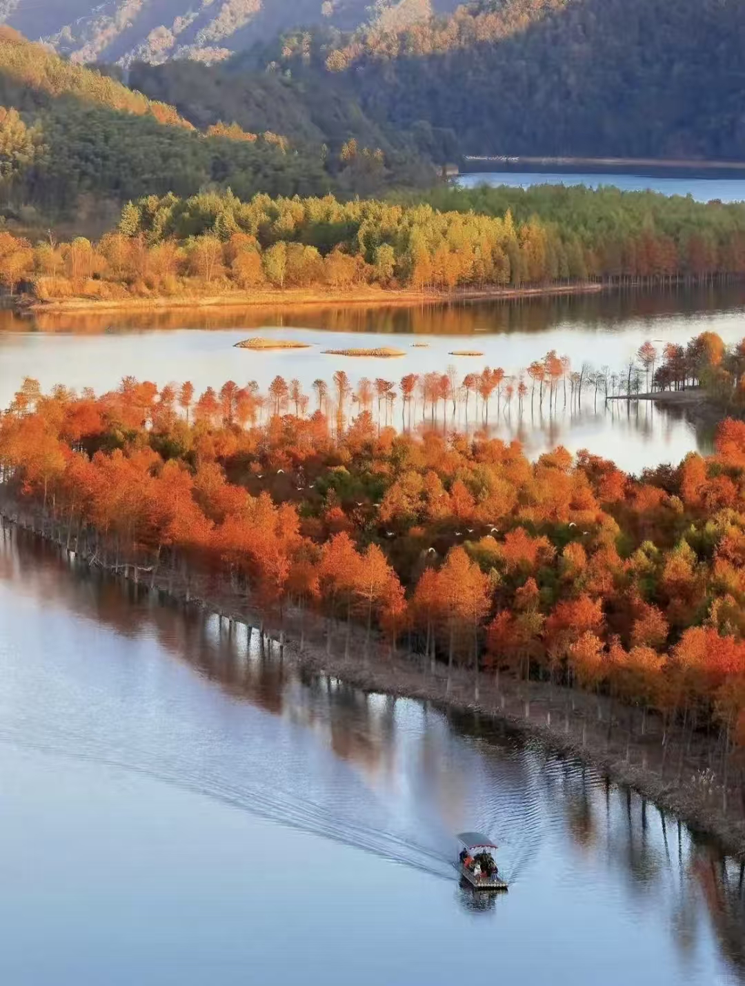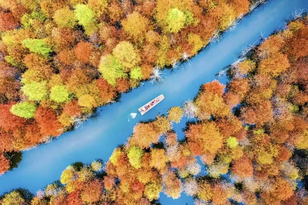 十一月中下旬的的【落羽红杉林】美得简直不像话,仿佛就是新疆喀纳斯。这是一片占地2000多亩的落羽杉,一片片红杉林在秋风的吹拂下轻轻摇曳,构成一派惊艳的叶色。乘坐游船近距离观赏红杉林,欣赏来自大自然的绝美!