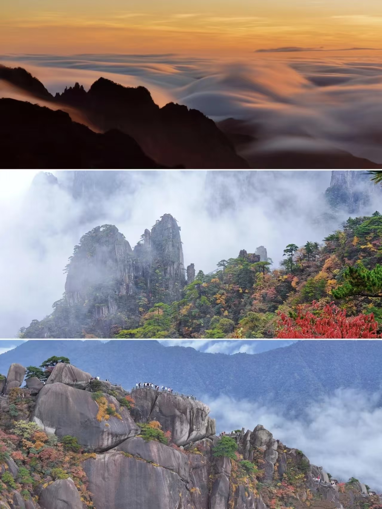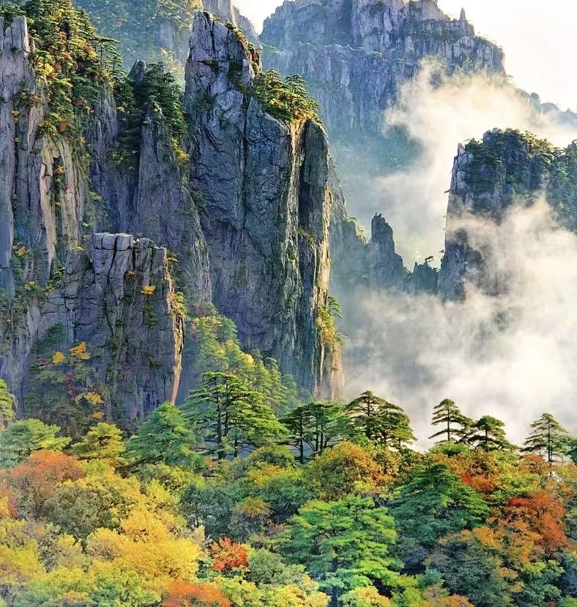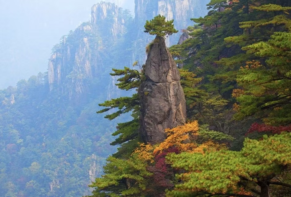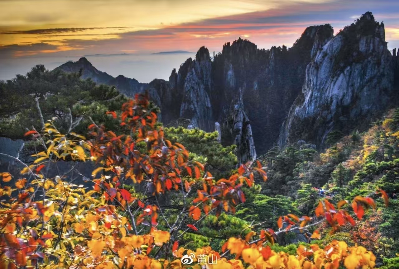 “枫林相间,五色纷披,灿若图绣。”明代大旅行家徐霞客也诗文赞赏黄山秋景。黄山的西海排云亭,西海大峡谷、散花坞、温泉景区、白云景区、云谷景区和松谷景区等地植被丰富,都是观赏秋色的最佳处……