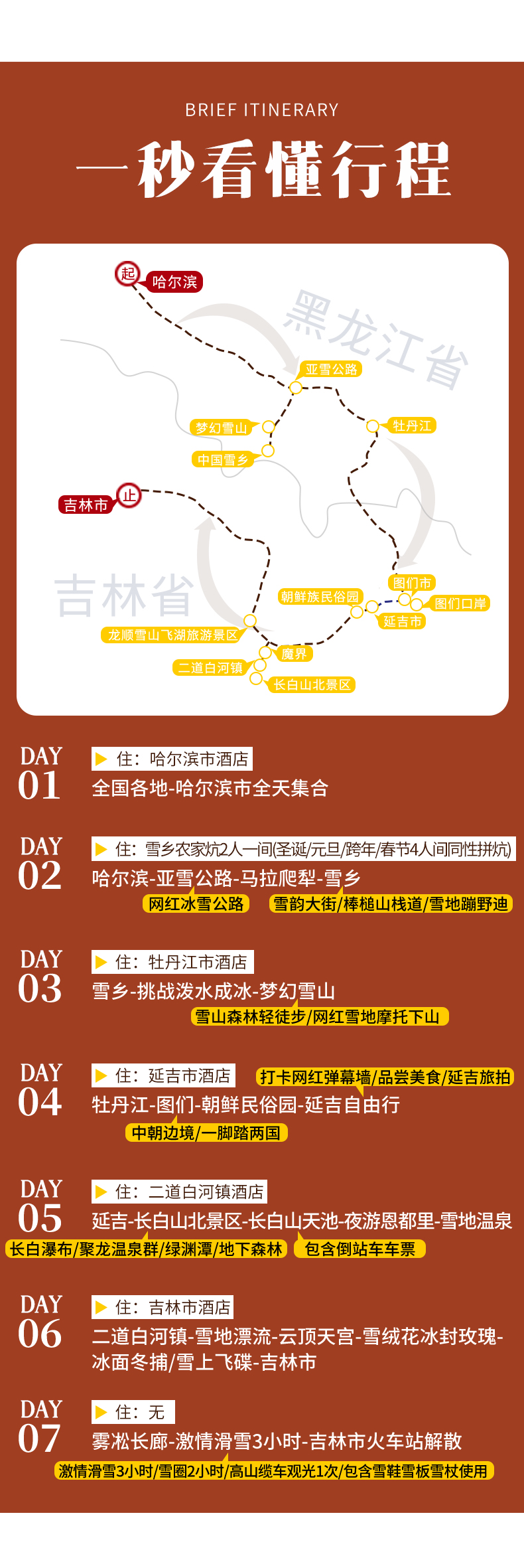 4、门票:雪乡门票+往返环保车、梦幻雪山徒步穿越门票、图们中朝友谊桥门票、朝鲜民俗园门票、长白山北景区全含(门票+往返环保车+摆渡车+天池倒站车)、雪地漂流门票、万科滑雪套票包含(雪鞋雪板雪杖头盔使用+滑雪3小时+雪圈2小时+高山缆车观光1次)