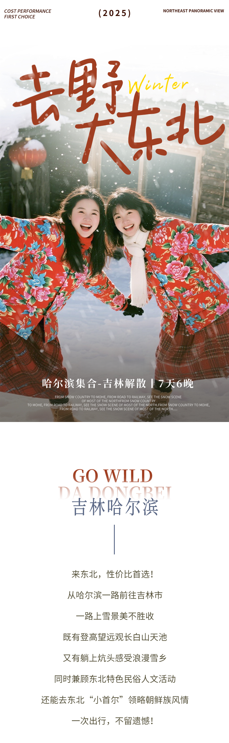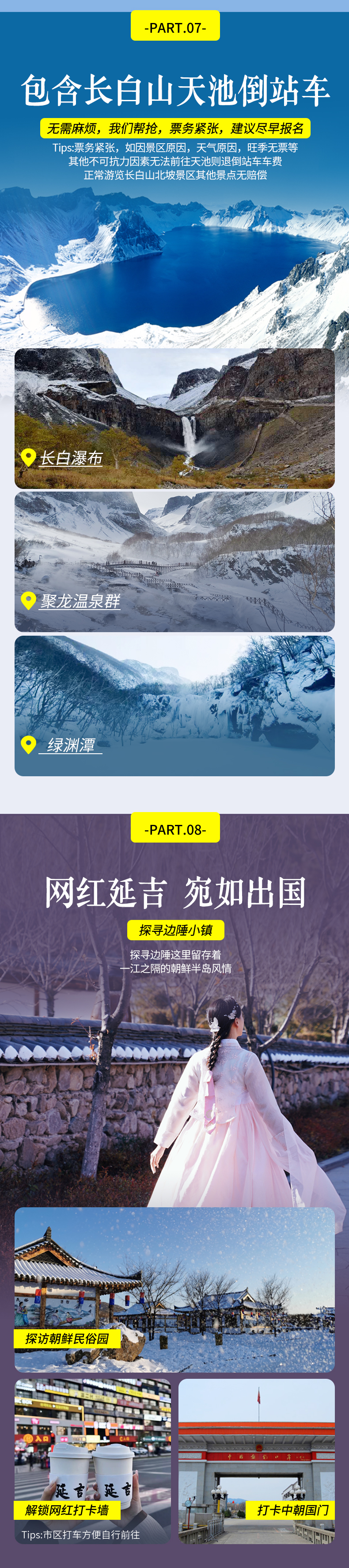 5、长白山由于冬季火爆限流前往,票务紧张,建议尽早报名好提前帮抢长白山天池倒站车票;如因景区原因、天气原因、旺季无票或者其他不可抗力因素无法前往则取消前往,退倒站车费用,其他景点正常游览无退费无赔偿。