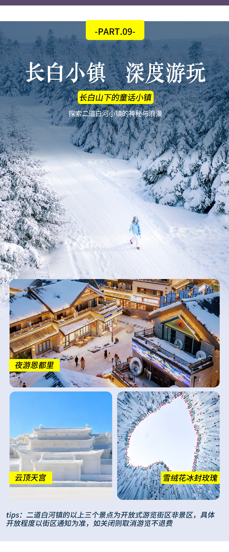 2、云顶天宫、雪绒花冰封玫瑰为开放式游览街区非景区,具体开放程度以街区通知为准,如关闭则取消游览不退费