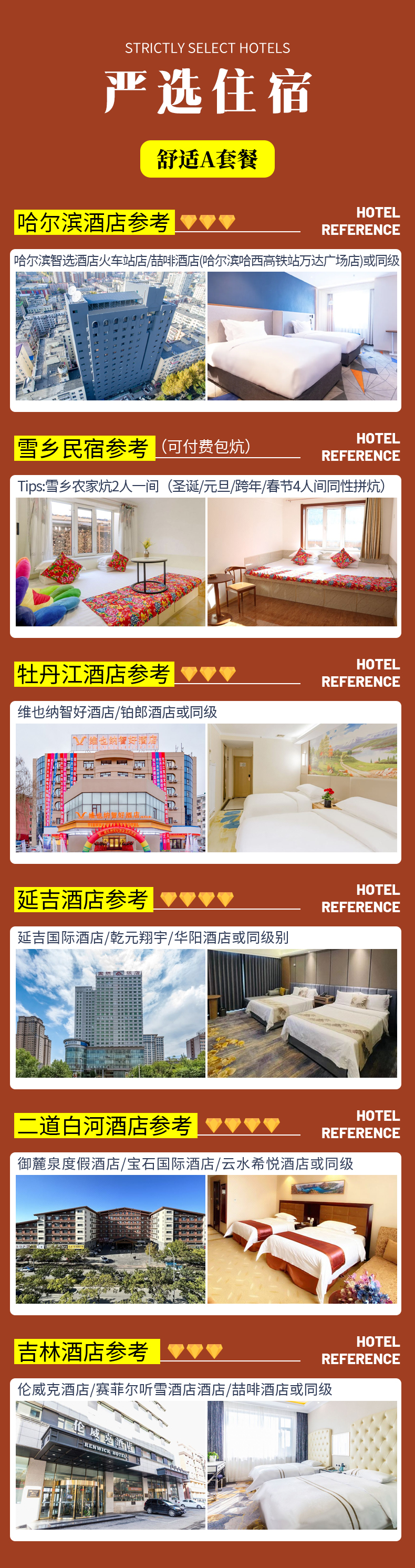 备注:钻级标准参考携程钻级标准,东北经济发展较差,酒店已经是我们精心挑选的,但是和大城市同级别酒店相比各方面略差一些,敬请您谅解;