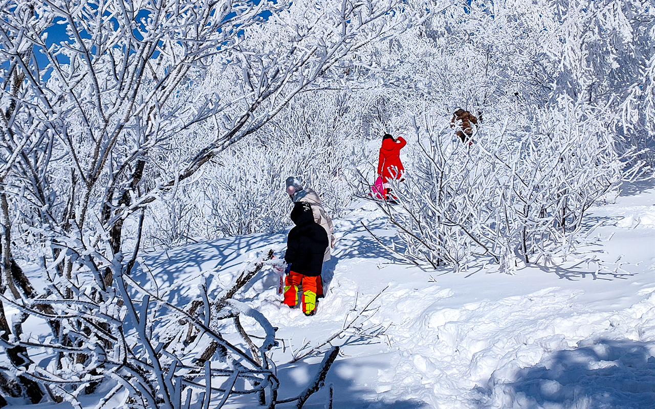 08:30前往【梦幻雪山轻徒步】,我们来到山脚,换上我们的登山雪套后随后跟着领队一步一个脚印上山;上山全程徒步4公里左右,用时约3小时,我们一路上边走边玩,移步换景,大家互相打闹着,玩雪,千万要注意安全哦~