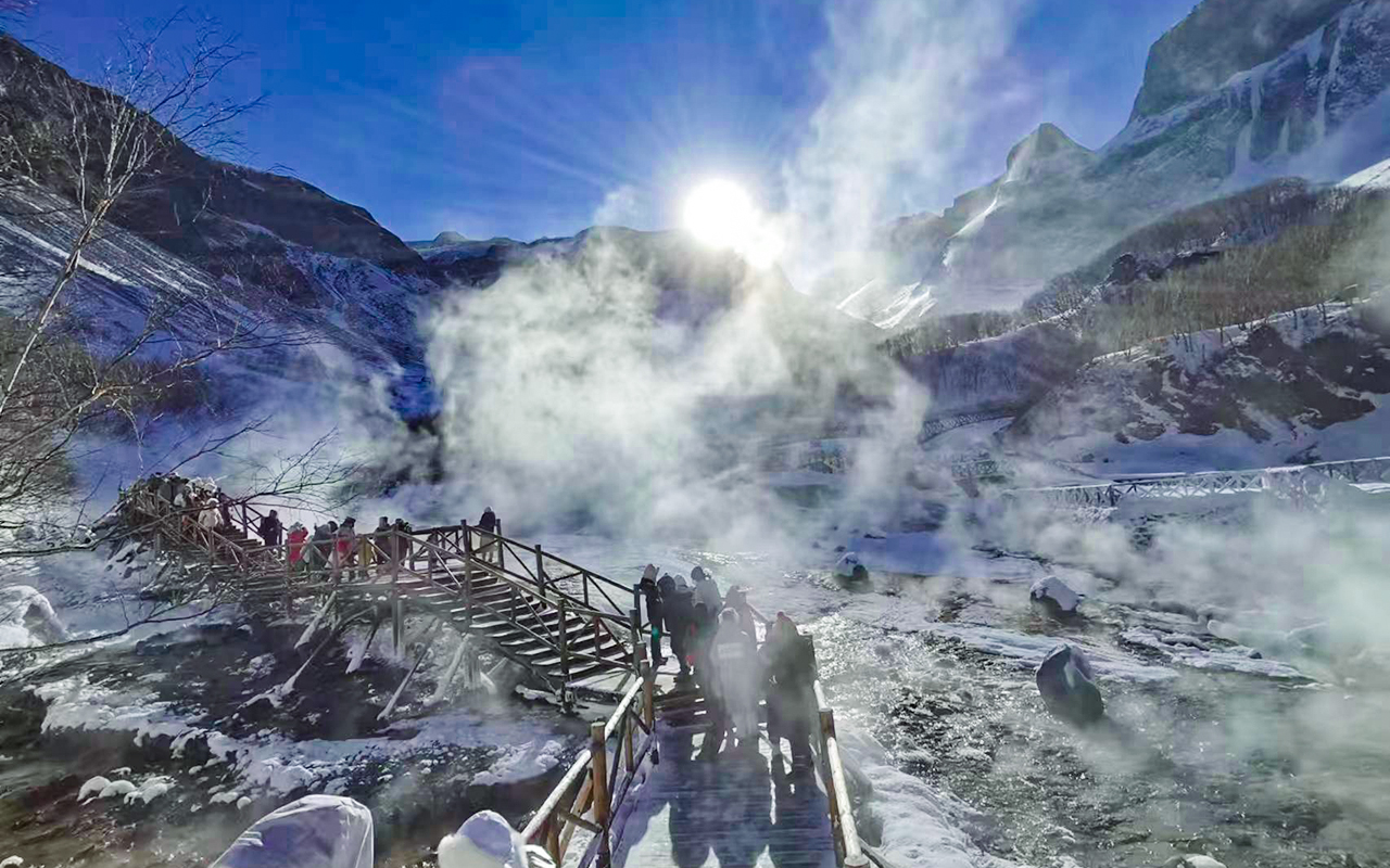 13:00 乘倒站车返回到中转服务站,换乘环保车赴【长白瀑布】,车程约10分钟,步行约20分钟到达长白冰雪瀑布底部近距离观看、摄影,参观【聚龙温泉群】,周围一片白雪,中间却热气腾腾,甚是美丽,游览30分钟,步行20分钟返回瀑布停车场。