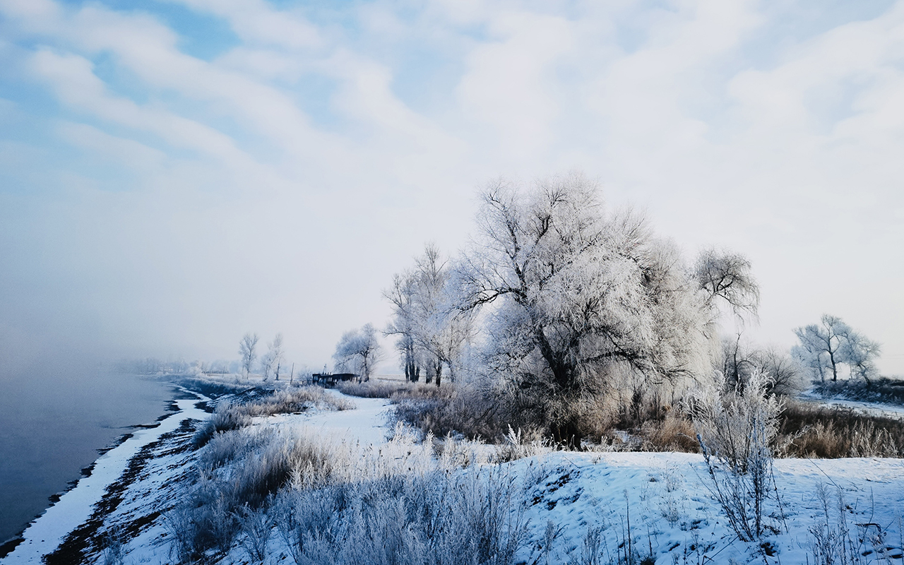 06:30 前往抵达【雾凇长廊】,这里不是景区,属于松花江畔的一座江边公园,每逢冬季,松花江畔的气温很低,水蒸气凝固在树上,从而形成雾凇。