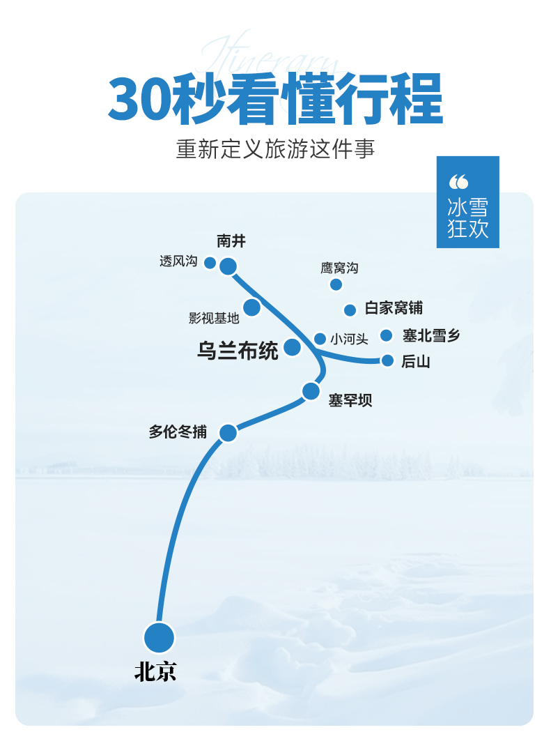 2. 行程内时间都为计划时间,如遇暴雪、堵车等情况,具体行程由领队安排。