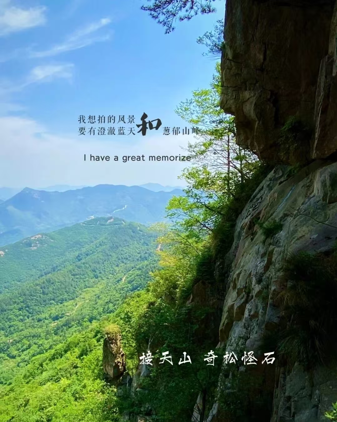 接天山奇石林立,拍照圣地:接天山是一座石山,怪石嶙峋,各种形态的石头尽展雄姿。最具有代表性的当属"鹞子翻身",腾空叠置的巨石,活脱脱一只即将展翅高飞的鹞子。群里勇敢的美女帅哥纷纷爬上鹞子背留影,上面的人很潇洒,旁边的人看着捏着一把冷汗。还有"仙人石",要翻下去才能与仙人亲密接触,绝对是打卡拍照的绝佳地点!