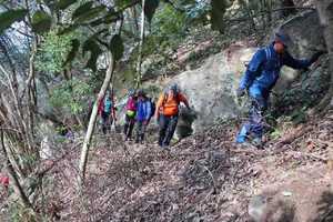 12:00 左右中午休息时大家拿出自带食物在山顶路餐。休息后,沿着山脊,向南下。