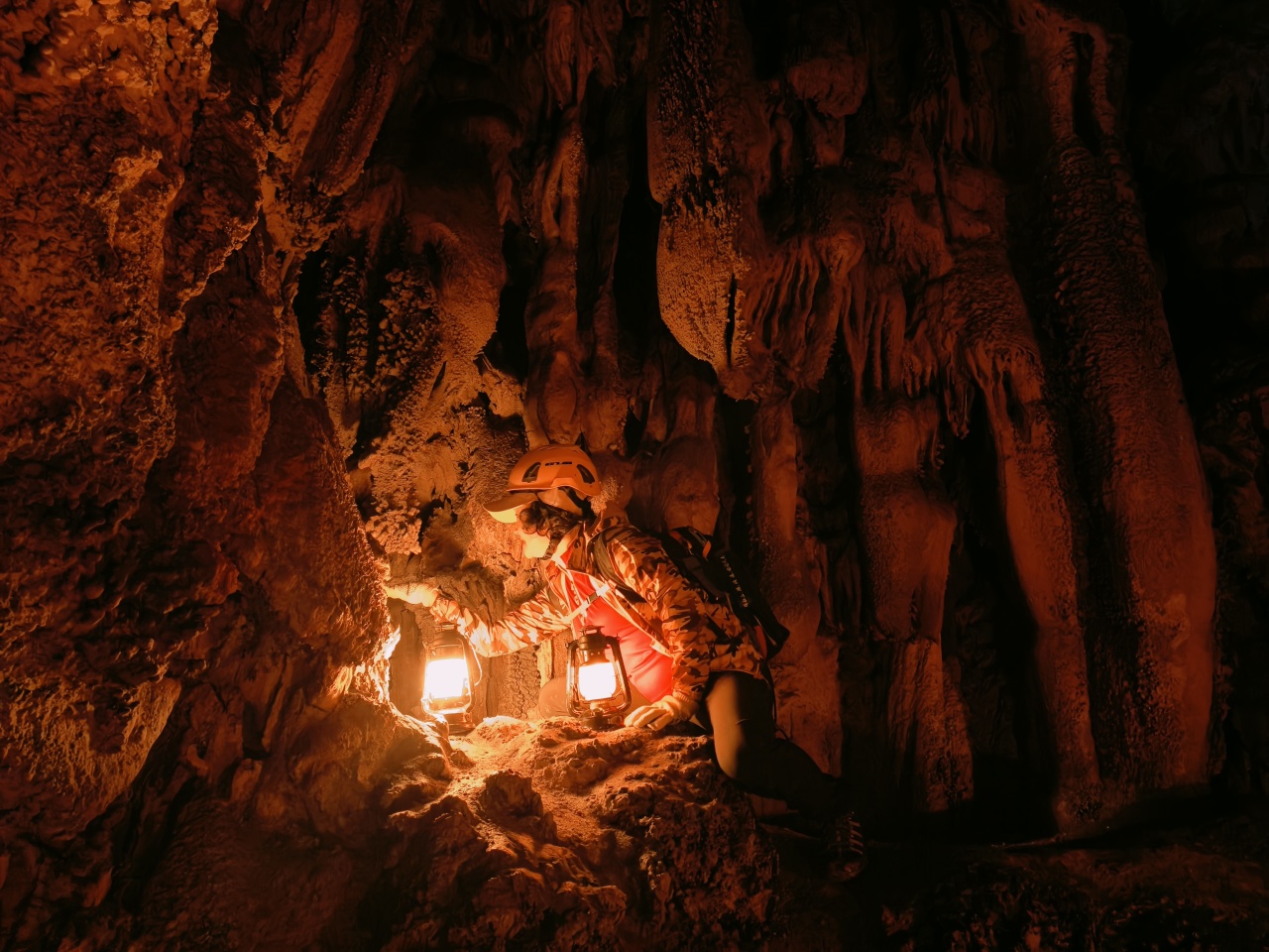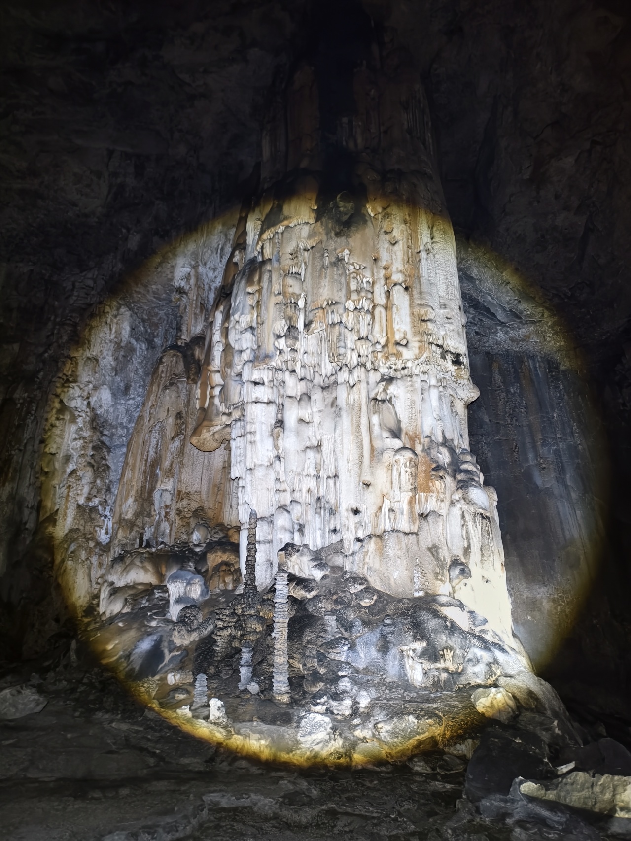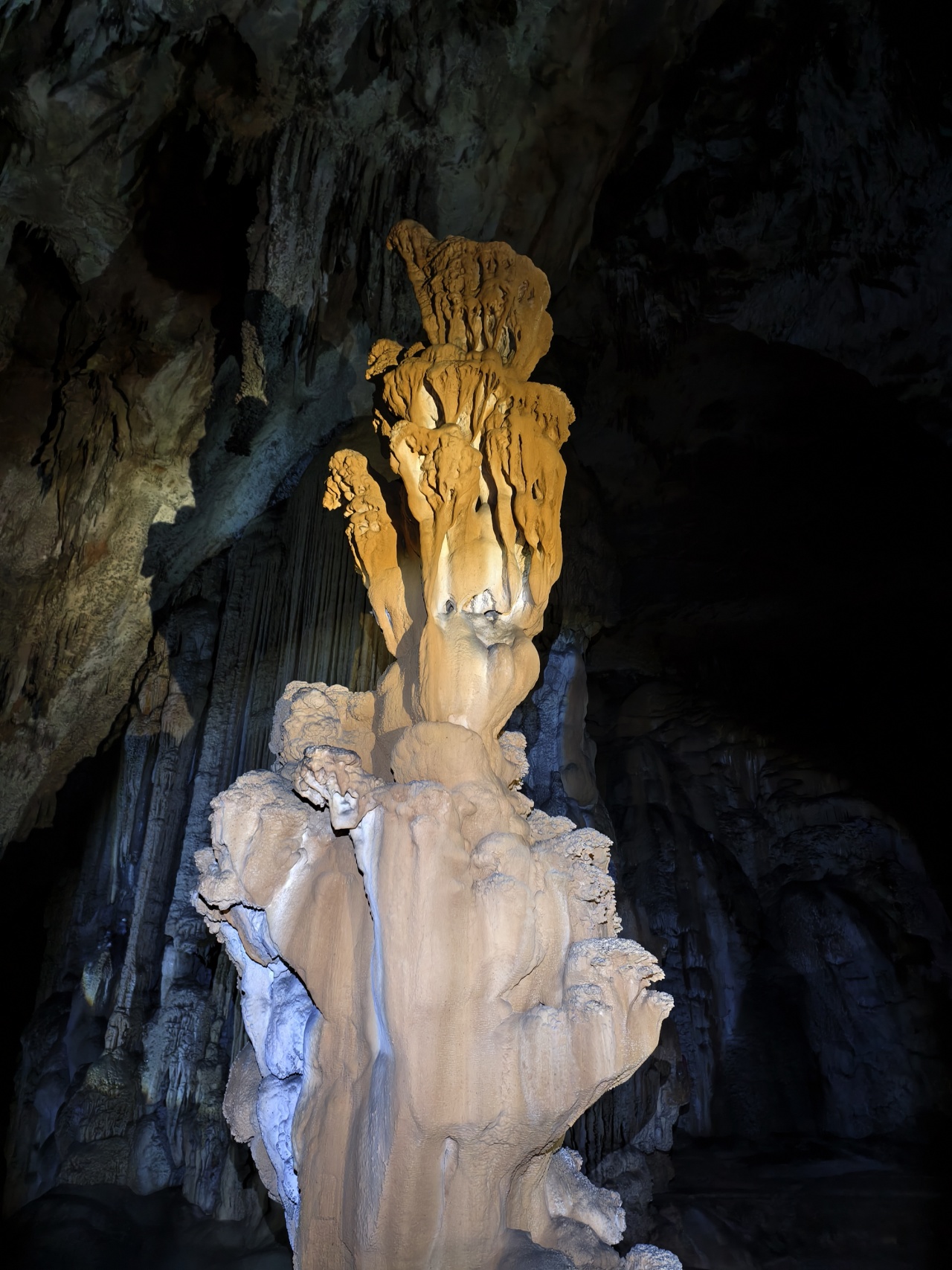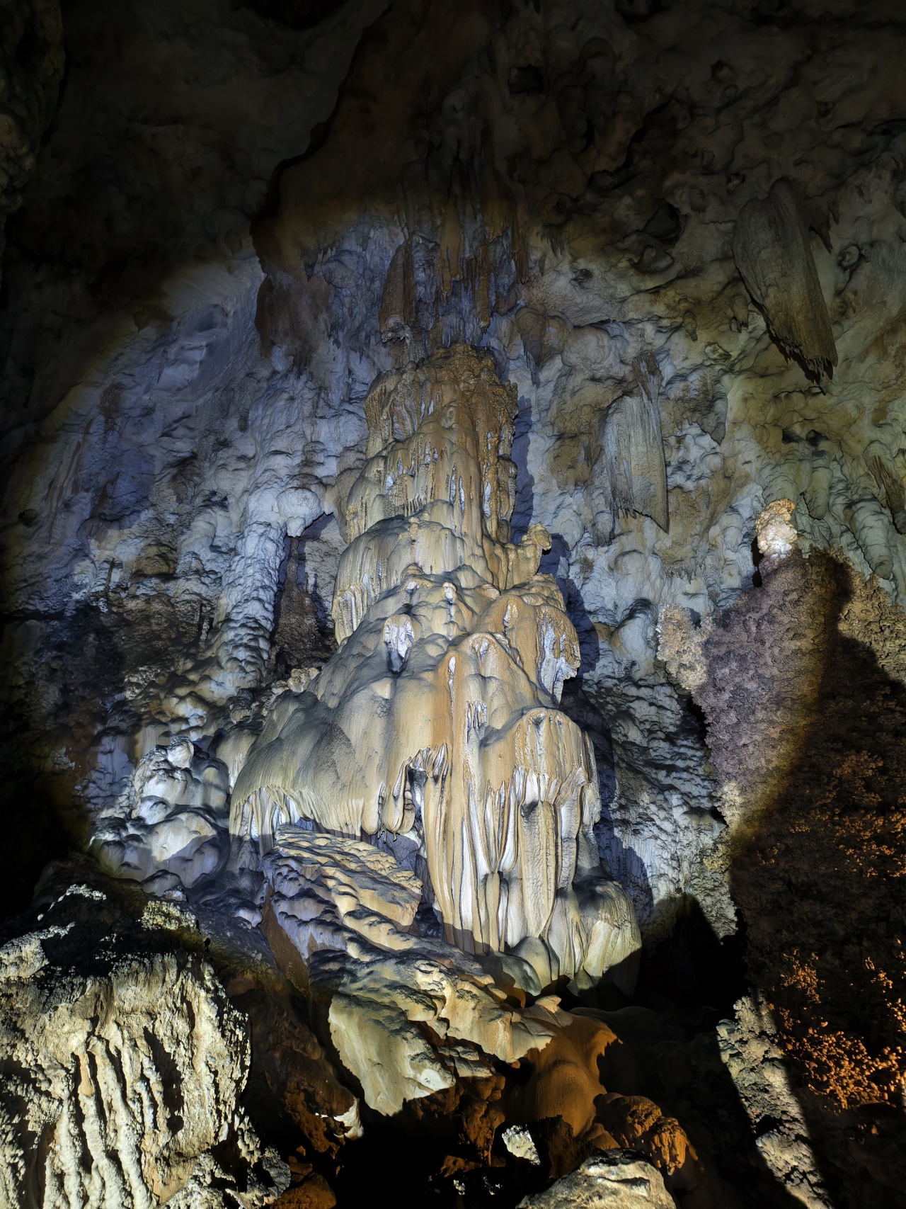 各种流石坝,美不胜收。溶洞里到处都石英砂晶石,用头灯一照,星光点点,如满天繁星