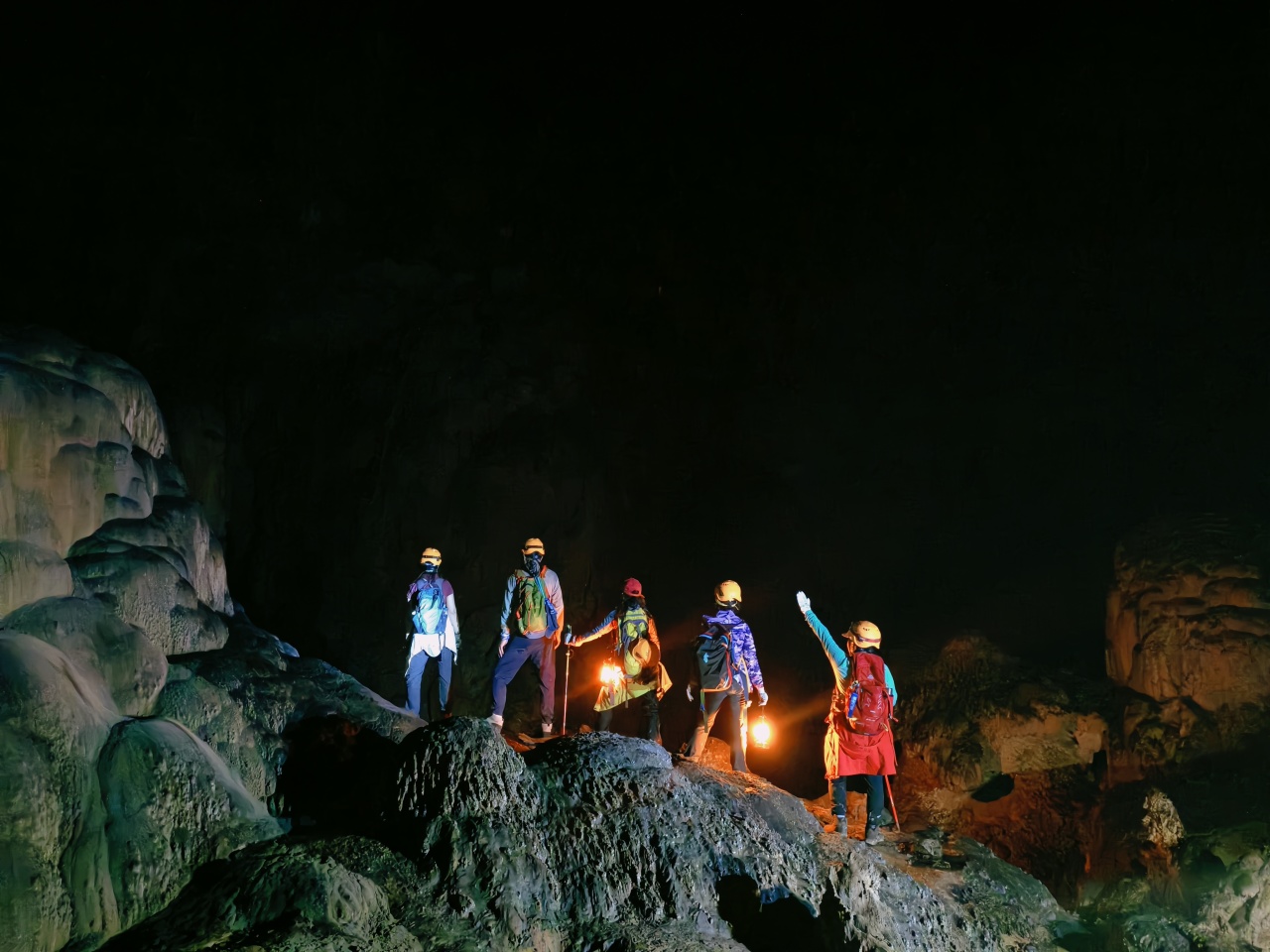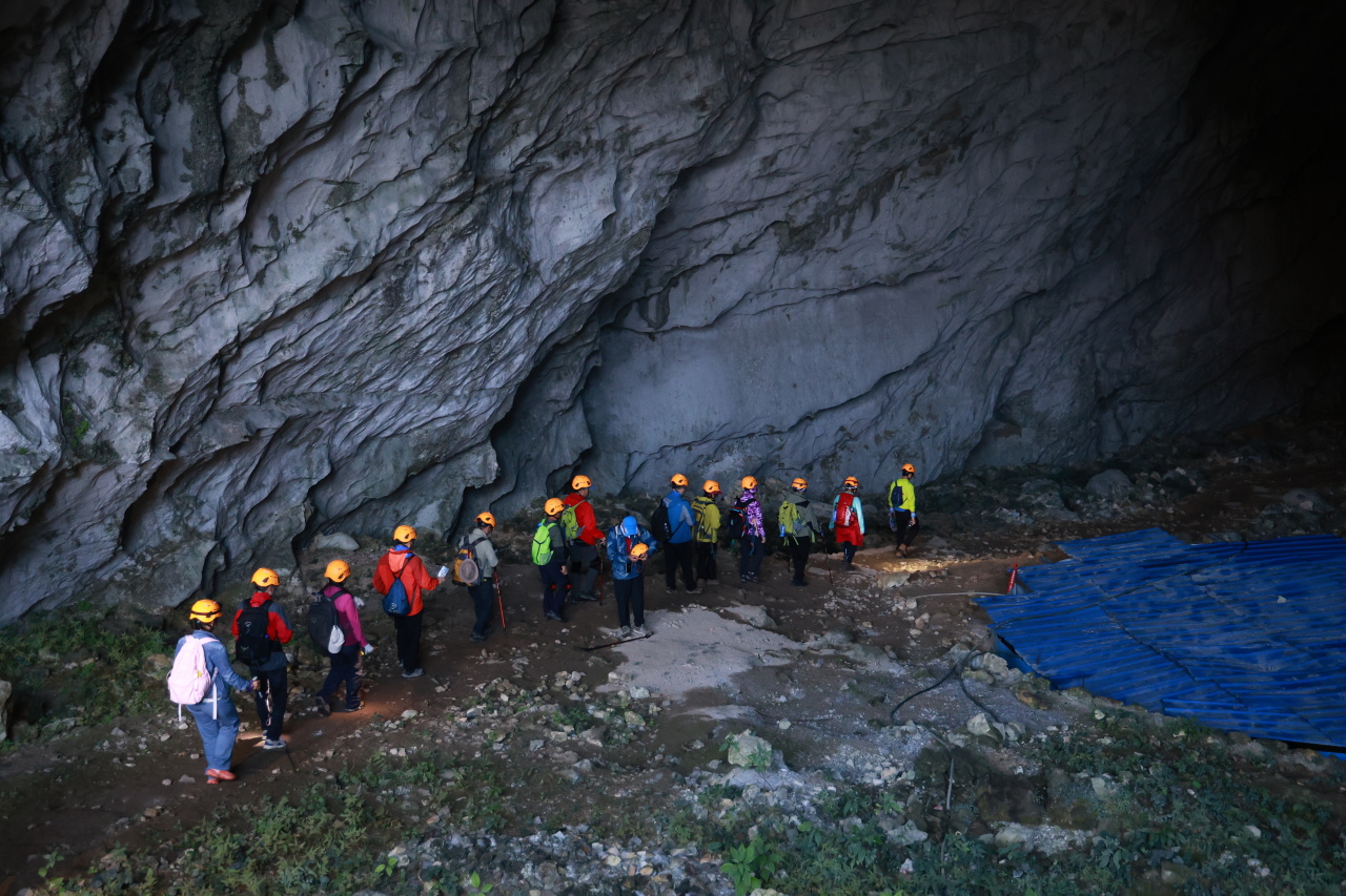 07:30徒步地心之旅。5小时的熊家俩洞连穿徒步穿越,线路很成熟,地心之旅徒步大会精华段就这里。这个季节,最合适早起登山,先进行一小段的登山,今天的午餐是路餐,只能是在洞里吃,带上温水,还有干粮,一起探索神奇的天坑溶洞世界吧