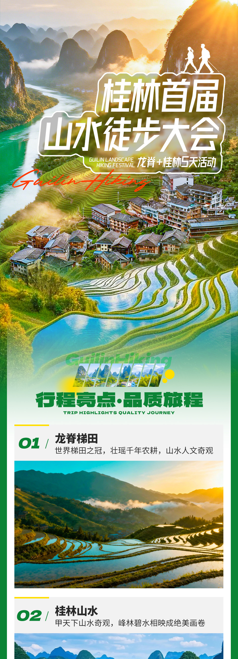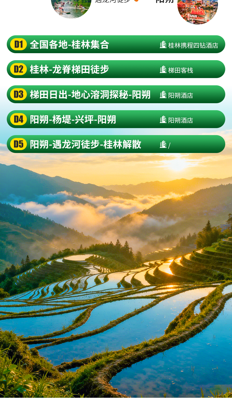 2.住宿:桂林四钻酒店,龙脊梯田客栈,阳朔2晚酒店,单人报名组织方优先安排同性拼,如遇到无同性需补房差400元)