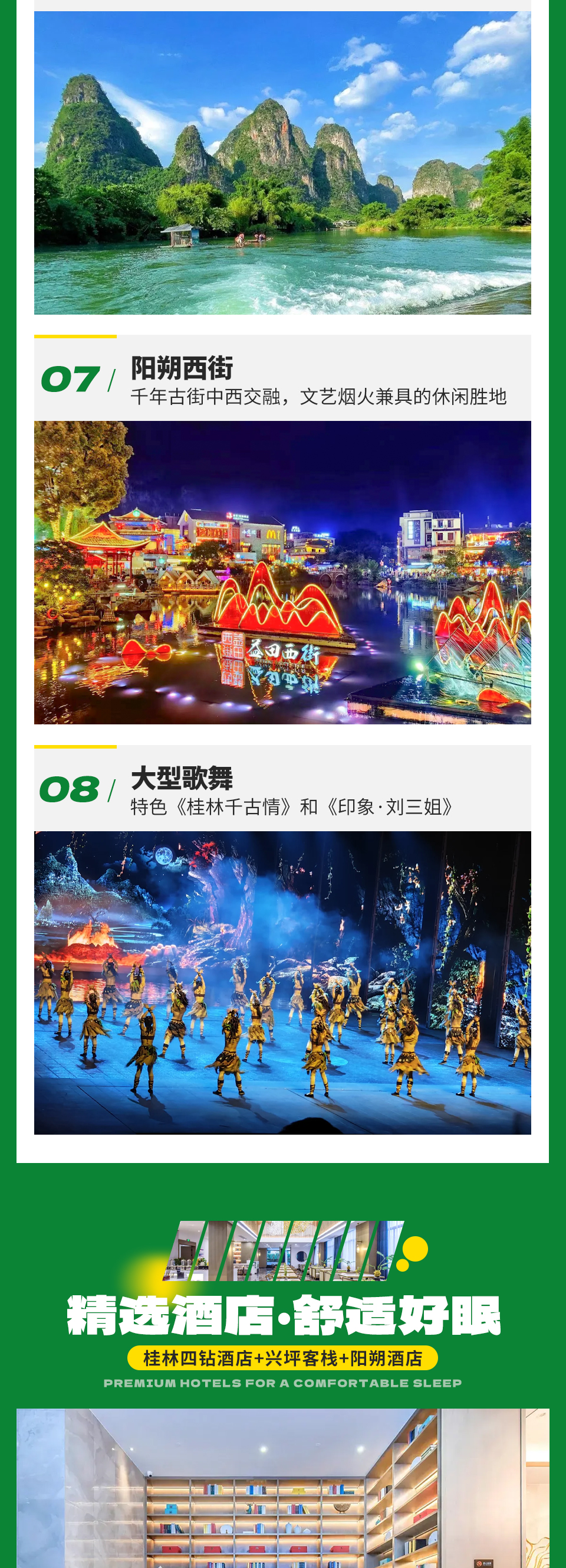 18:00 晚饭过后可以也可以可自费观看《桂林千古情》或者《印象刘三姐》,这是一生必看的演出。将掩藏在八百里漓江山水下的八桂文化带入大家的视野,视觉盛宴,心灵震撼!
